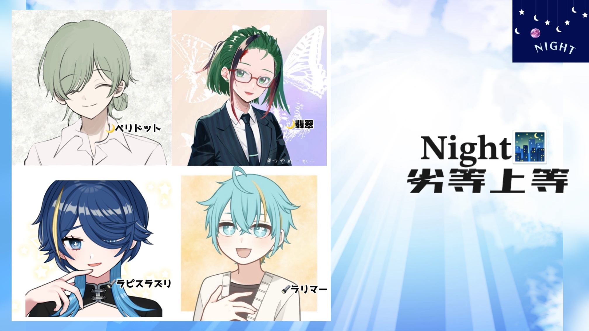 MOON🌙 / 𝐍𝐢𝐠𝐡𝐭🌃 / peridot役🖼 1.劣等上等(2025.08.31) 2.踊れオーケストラ(2025.09.20) 3.革命道中 - On The Way(2025.11.02) 4.クリスマスの足音 / 声劇(2025.12.24) 5.新年 / 声劇(2026.01.01)
